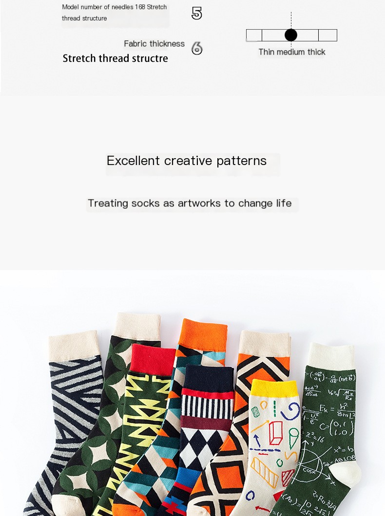 Made from soft, breathable cotton, these mid-calf socks provide all-day comfort whether you're at work, relaxing at home, or heading out. Each design features a unique artistic pattern — from geometric styles to playful doodles — making them perfect for anyone who loves expressive fashion.