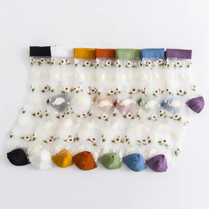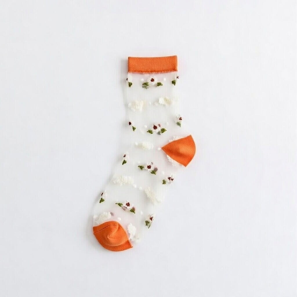 Featuring a mesh process and a delightful small flower pattern, these socks are perfect for spring and summer wear. The middle tube height provides a flattering silhouette while maintaining a thin thickness that pairs beautifully with any shoe style. Available in four stunning colors: Black, Orange, Blue, and White, there's a perfect match for every outfit.